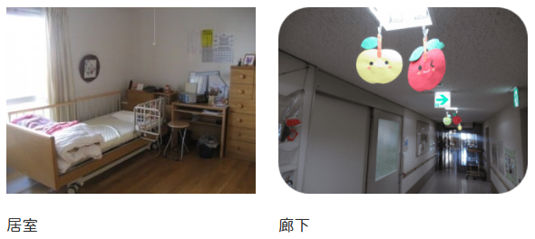 全室ユニット型個室(約8畳)で、ご利用者の皆様に快適な生活を過ごして頂けるような環境作りをしています。長年ご愛用の調度品、思い出の品々等、その人らしい素敵なお部屋を作って下さい。※居室にはベッドとエアコンを常備しております。